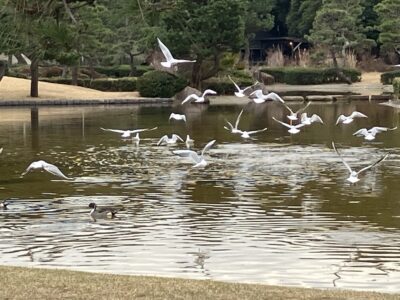 池には優雅に舞う水鳥の姿が